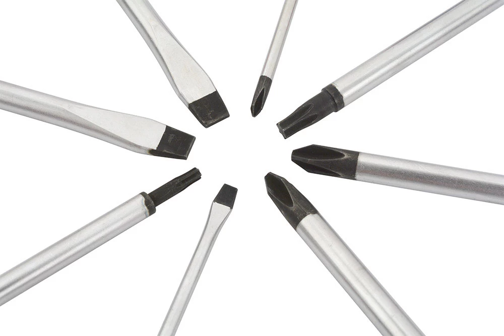 Le jeu de tournevis Pro de huit pièces comprend trois tournevis à fente, trois tournevis cruciformes et deux tournevis Torx – des outils indispensables de qualité atelier en acier au chrome-vanadium avec pointes brunies et poignées confortables en plastique caoutchouté.